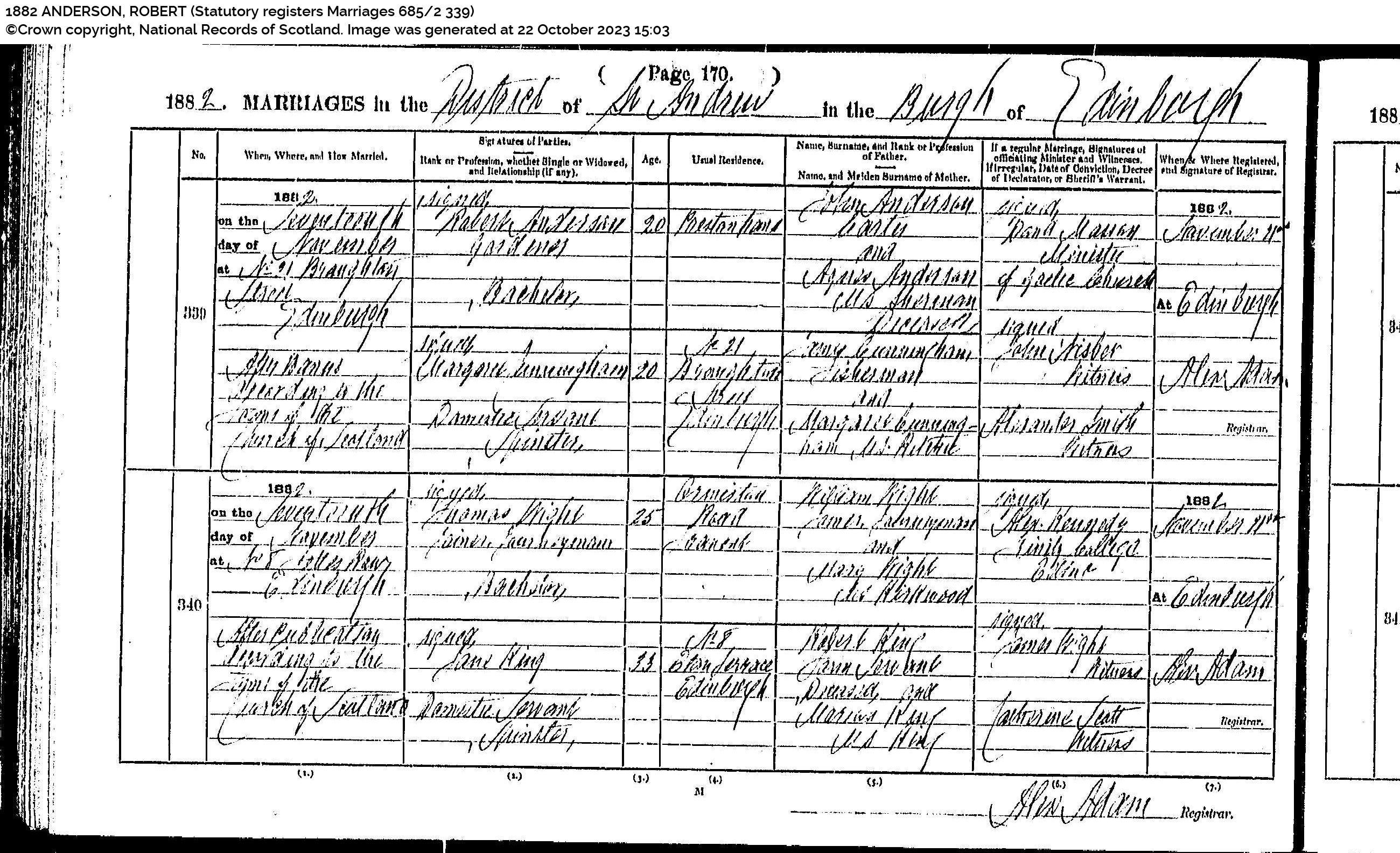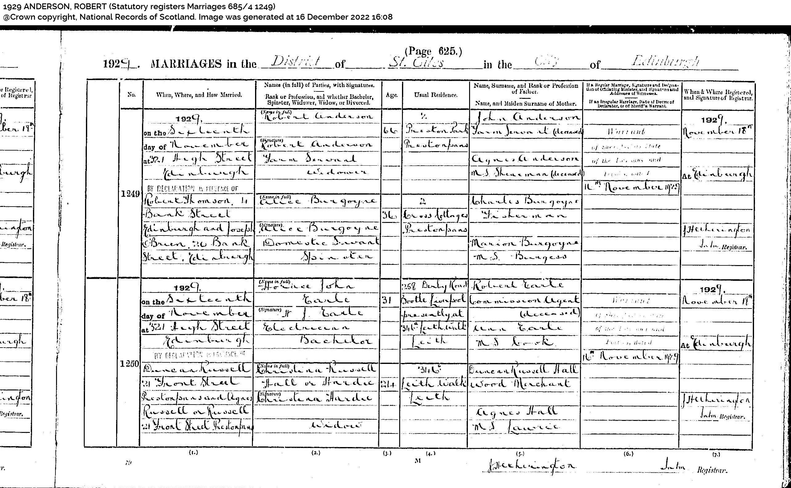 | 240 | SP | STAT | MAR | 1929 | R220.jpg | 1929-11-16 MAR Robert Anderson + Alice Burgoyne Edinburgh [[R220]] | LOCAL | ONLINE |