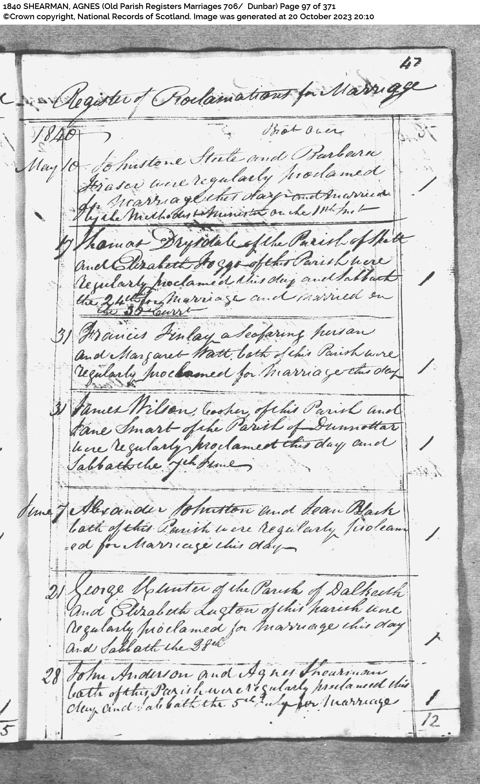 | 225 | SP | CH | MAR | 1840 | R207.jpg | 1840-06-28 MAR John Anderson + Agnes Shearman – Dunbar, Haddingtonshire [[R207]] | LOCAL | ONLINE |