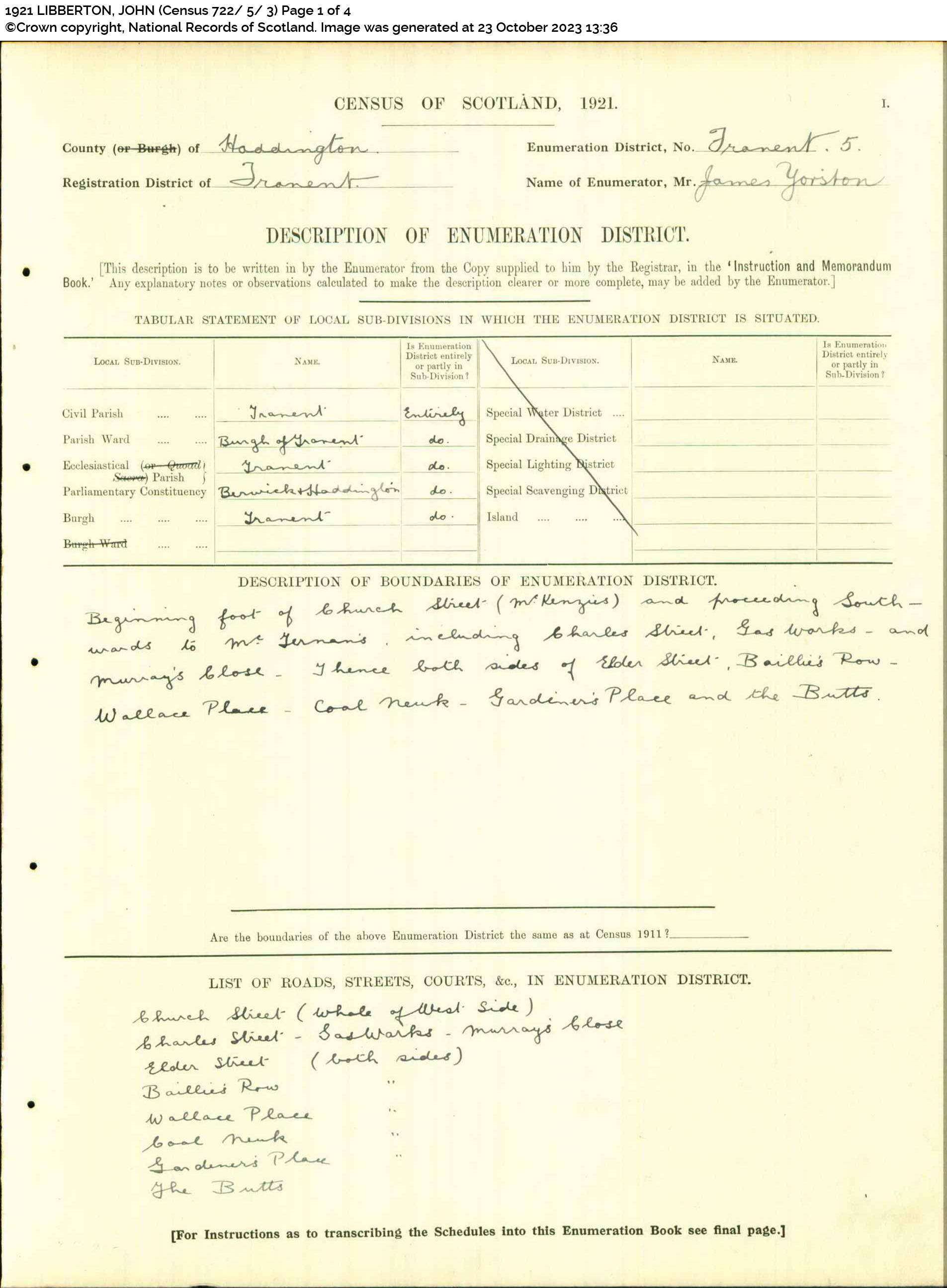 | 233 | SP | STAT | CEN | 1921 | R213-h1.jpg | 1921-06-19 CEN John Libberton + Agnes Shearman – 155 Church Street, Tranent [[R213-h1]] | LOCAL | ONLINE |