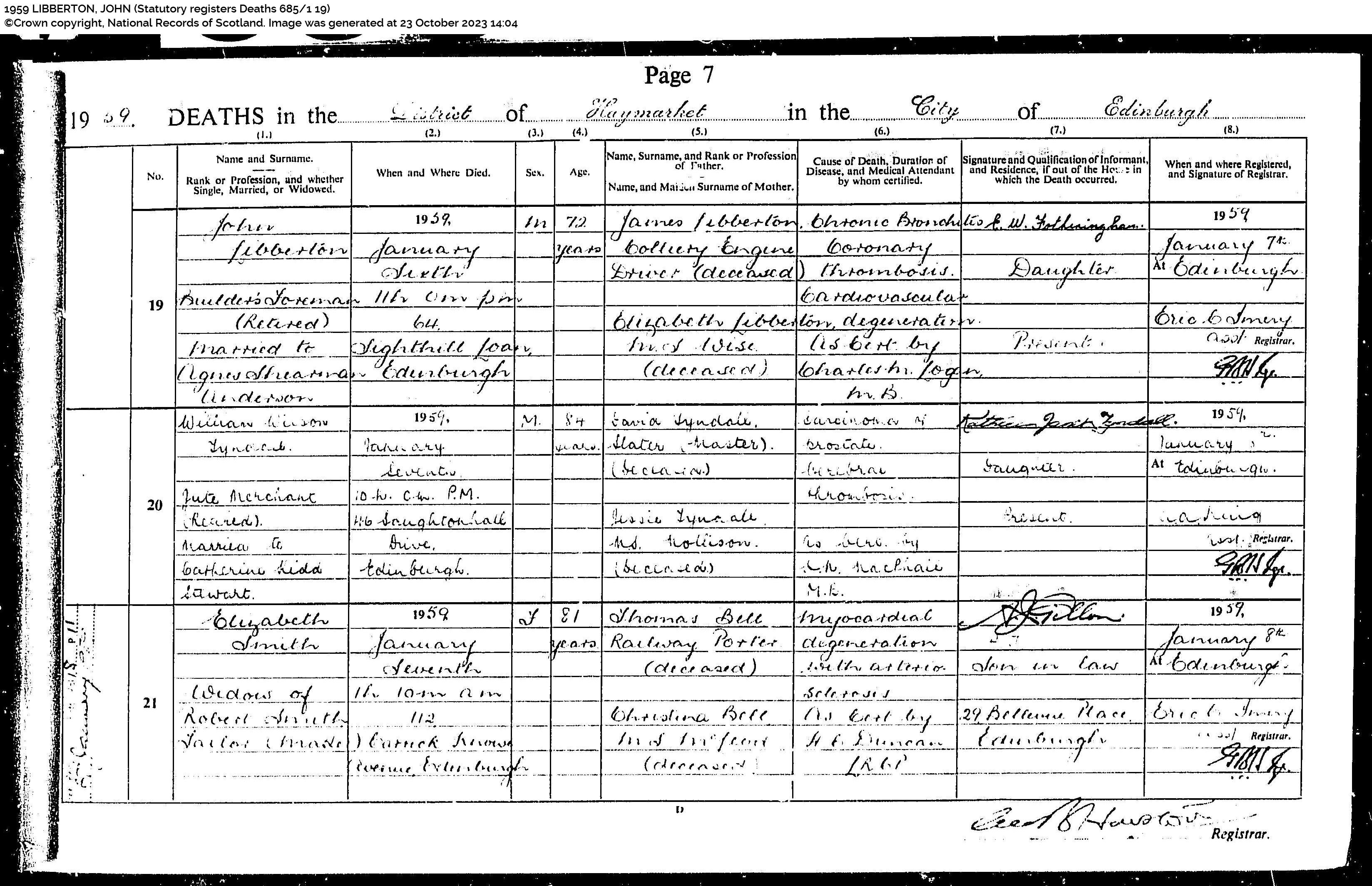 | 237 | SP | STAT | DEA | 1959 | R216.jpg | 1959-01-06 DEA John Libberton husband of Elizabeth Libberton or Wise – Edingburgh [[R216]] | LOCAL | ONLINE |