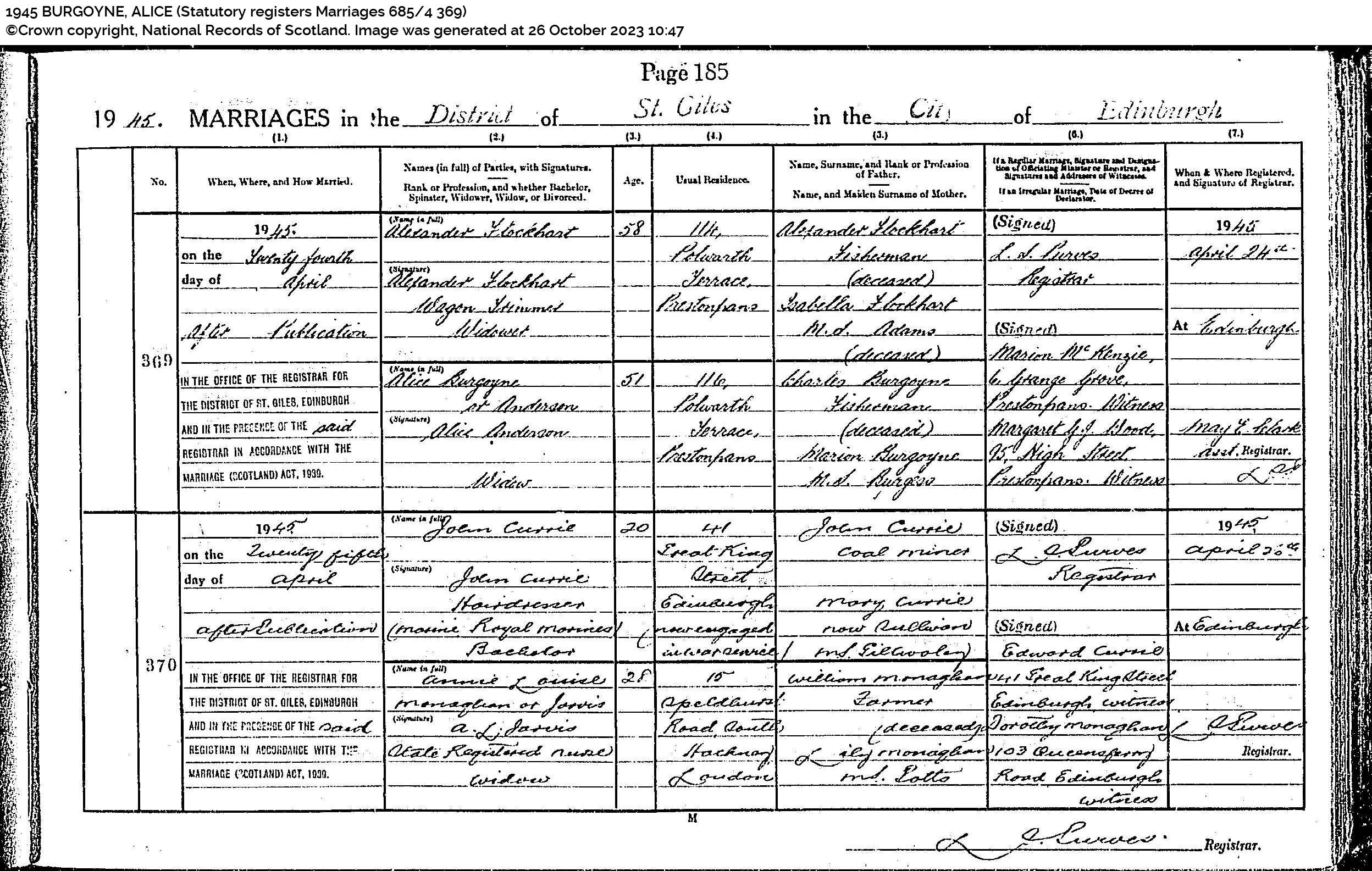 | 241 | SP | STAT | MAR | 1945 | R221.jpg | 1945-04-24 MAR Alice Burgoyne + Alexander Flockhart – St. Giles [[R221]] | LOCAL | ONLINE |