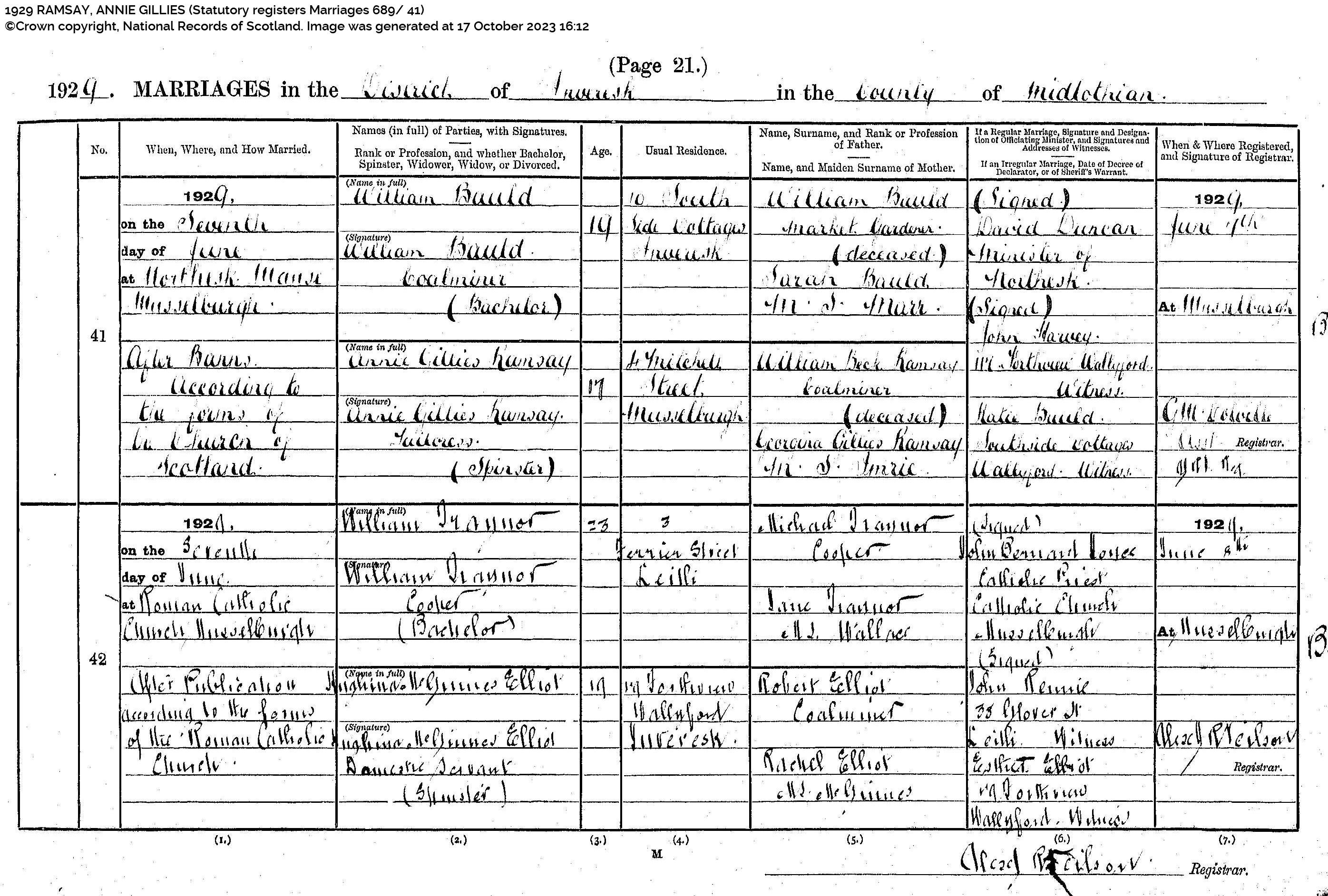 | 242 | SP | STAT | MAR | 1929 | R222.jpg | 1929-06-07 MAR Anne Gillies Ramsay + William Bauld – Musselburgh [[R222]] | LOCAL | ONLINE |