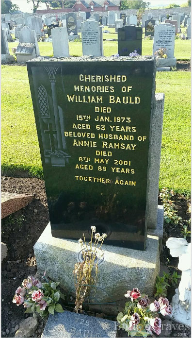 | 243 | BG | MON | GRA | 1973 | R223.jpg | 1973-01-15 GRA Gravestone of William Bauld d. 1973 + Annie Ramsay d. 2001 [[R223]] | LOCAL | ONLINE |