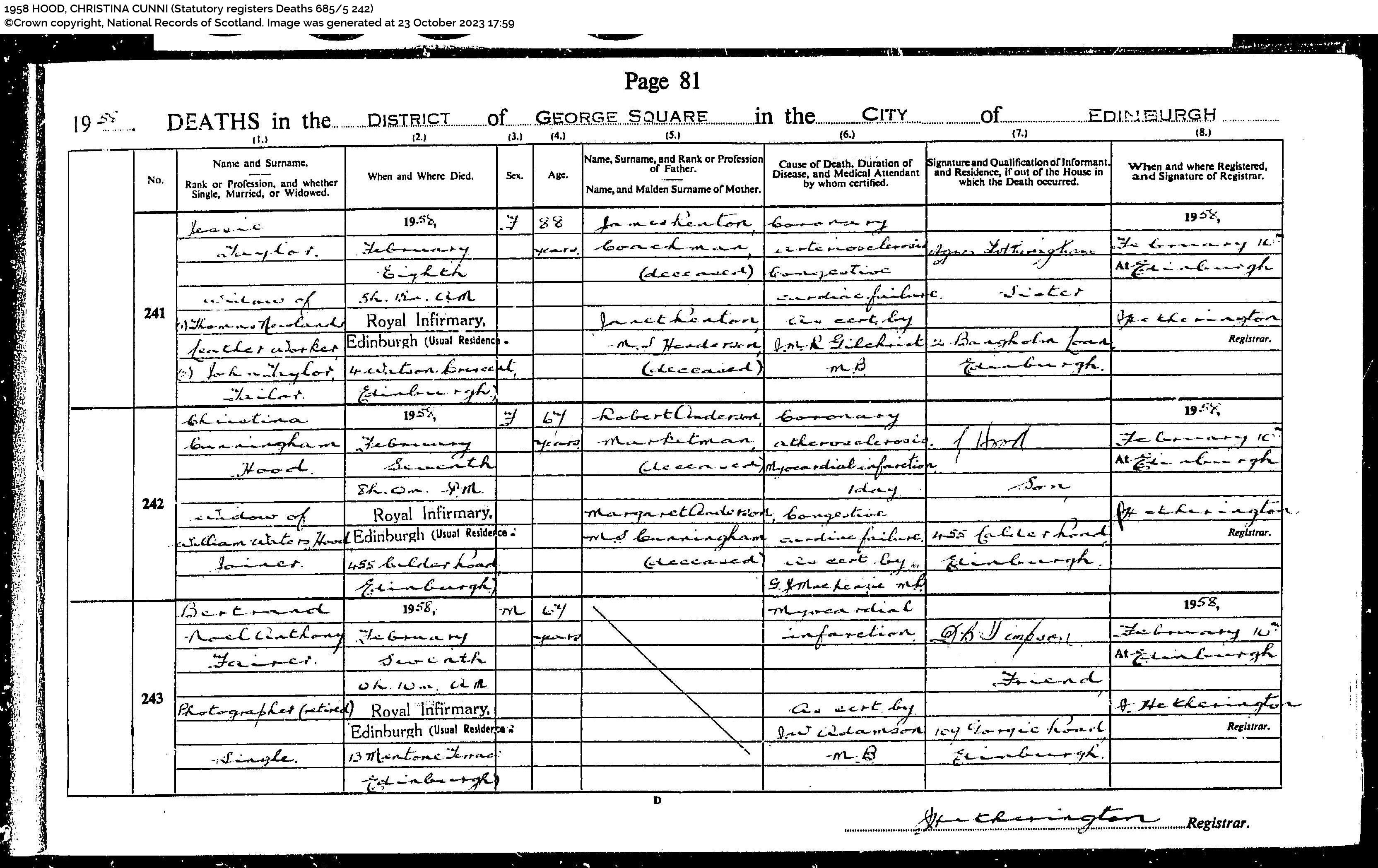 | 246 | SP | STAT | DEA | 1958 | R226.jpg | 1958-02-17 DEA Christina Hood or Cunningham – 455 Calder Road, Edinburgh [[R226]] | LOCAL | ONLINE |