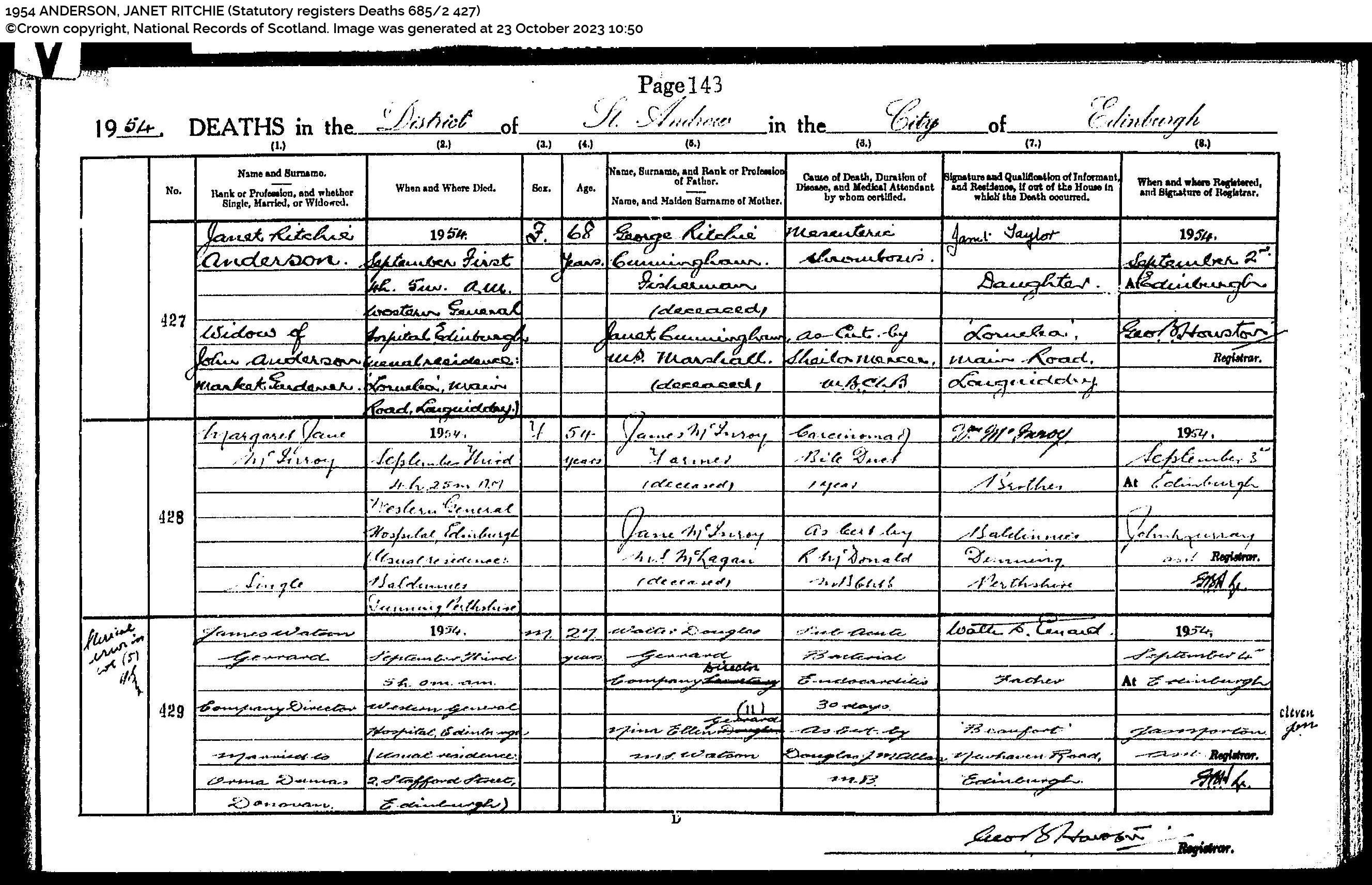 | 259 | SP | STAT | DEA | 1954 | R239.jpg | 1954-09-01 DEA Janet R Cunningham or Anderson widow of John Anderson – Longniddry [[R239]] | LOCAL | ONLINE |