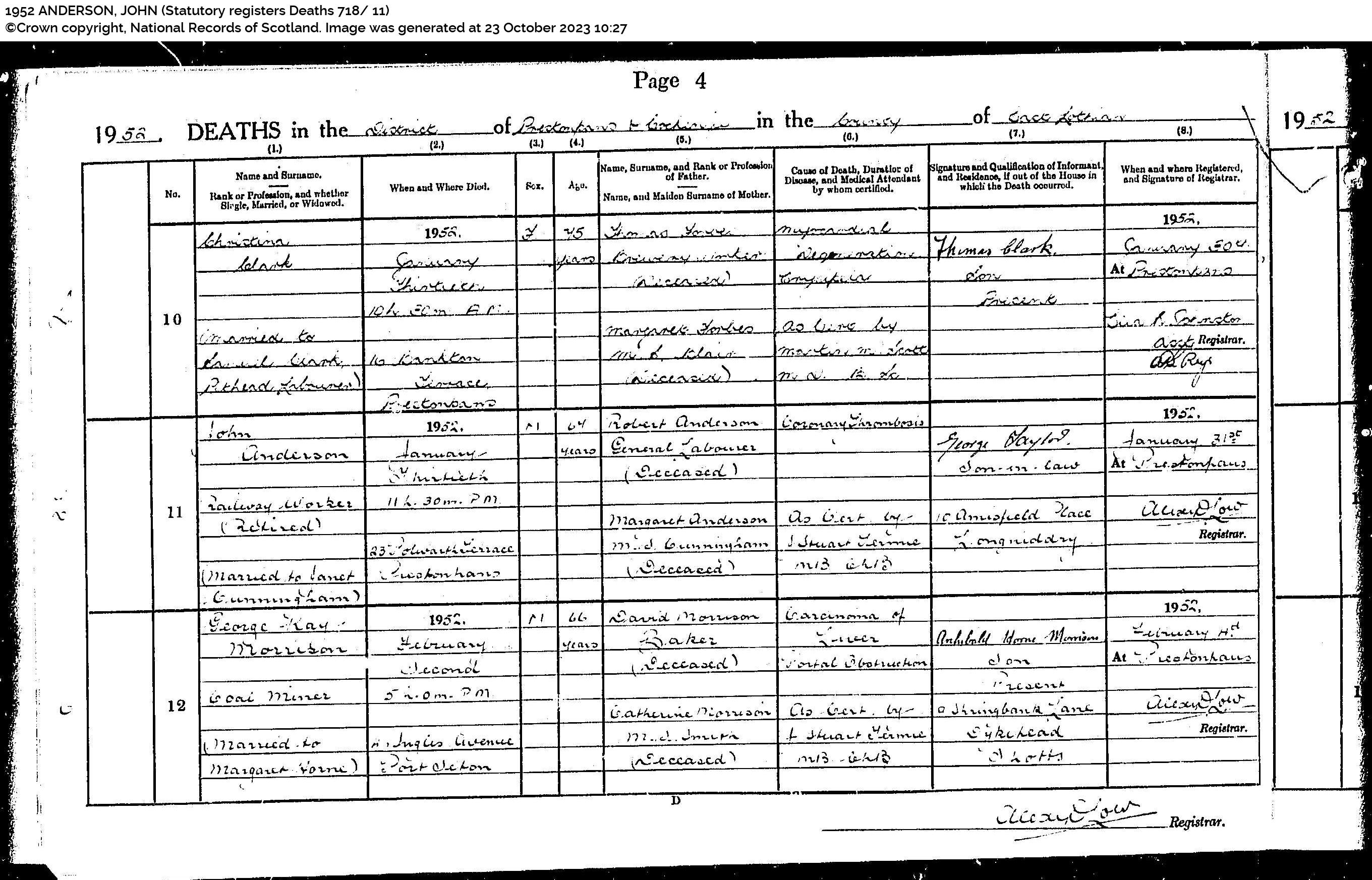 | 260 | SP | STAT | DEA | 1952 | R240.jpg | 1952-01-30 DEA John Anderson husband of Janet R Cunningham – 23 Polworth Terrace, Prestonpans [[R240]] | LOCAL | ONLINE |