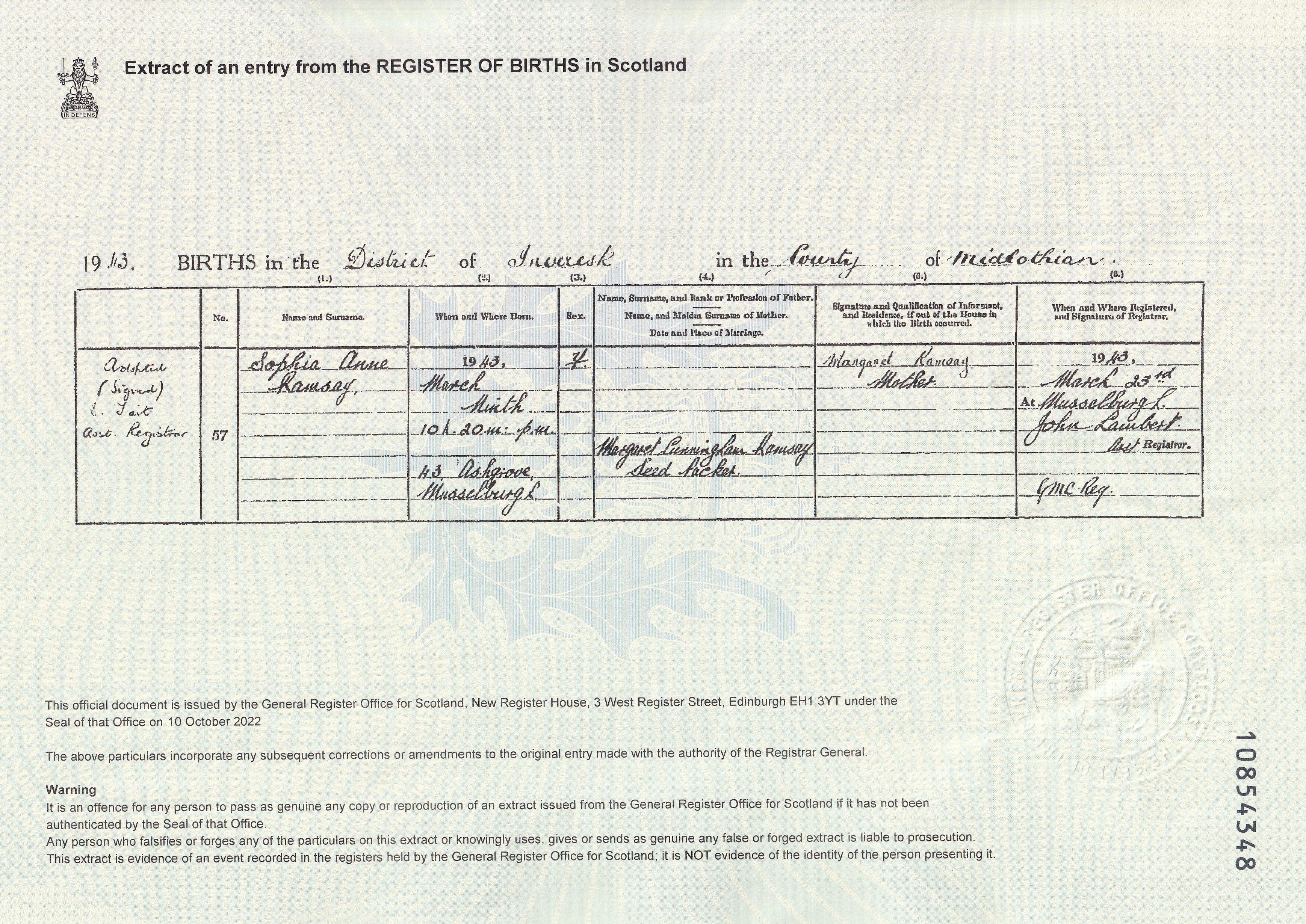| 322 | SP | STAT | DEA | 1950 | R292.jpg | 1950-01-17 DEA Sophia Ramsay or Anderson – 43 Ashgrove, Mussselburgh [[R292]] | LOCAL | ONLINE |