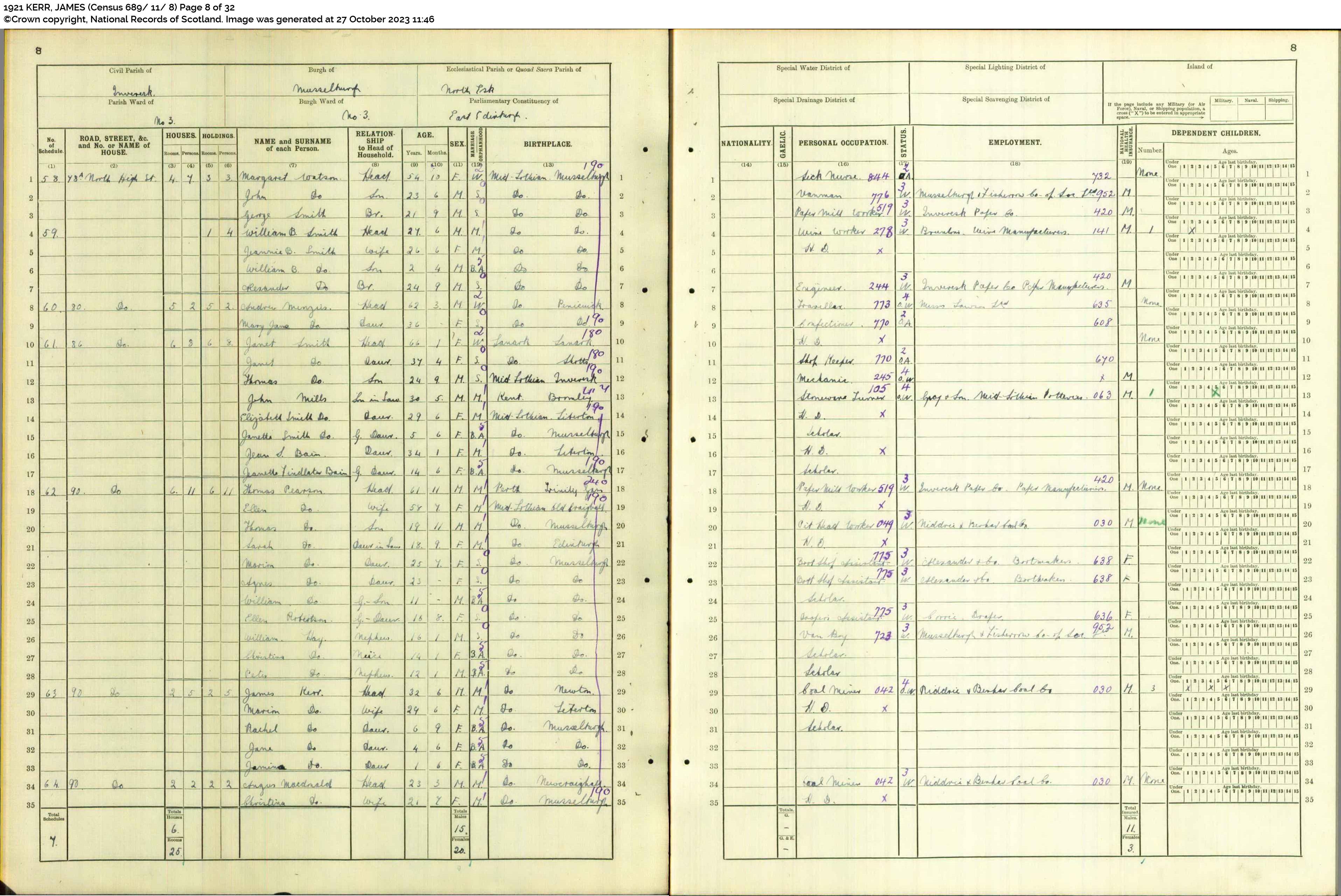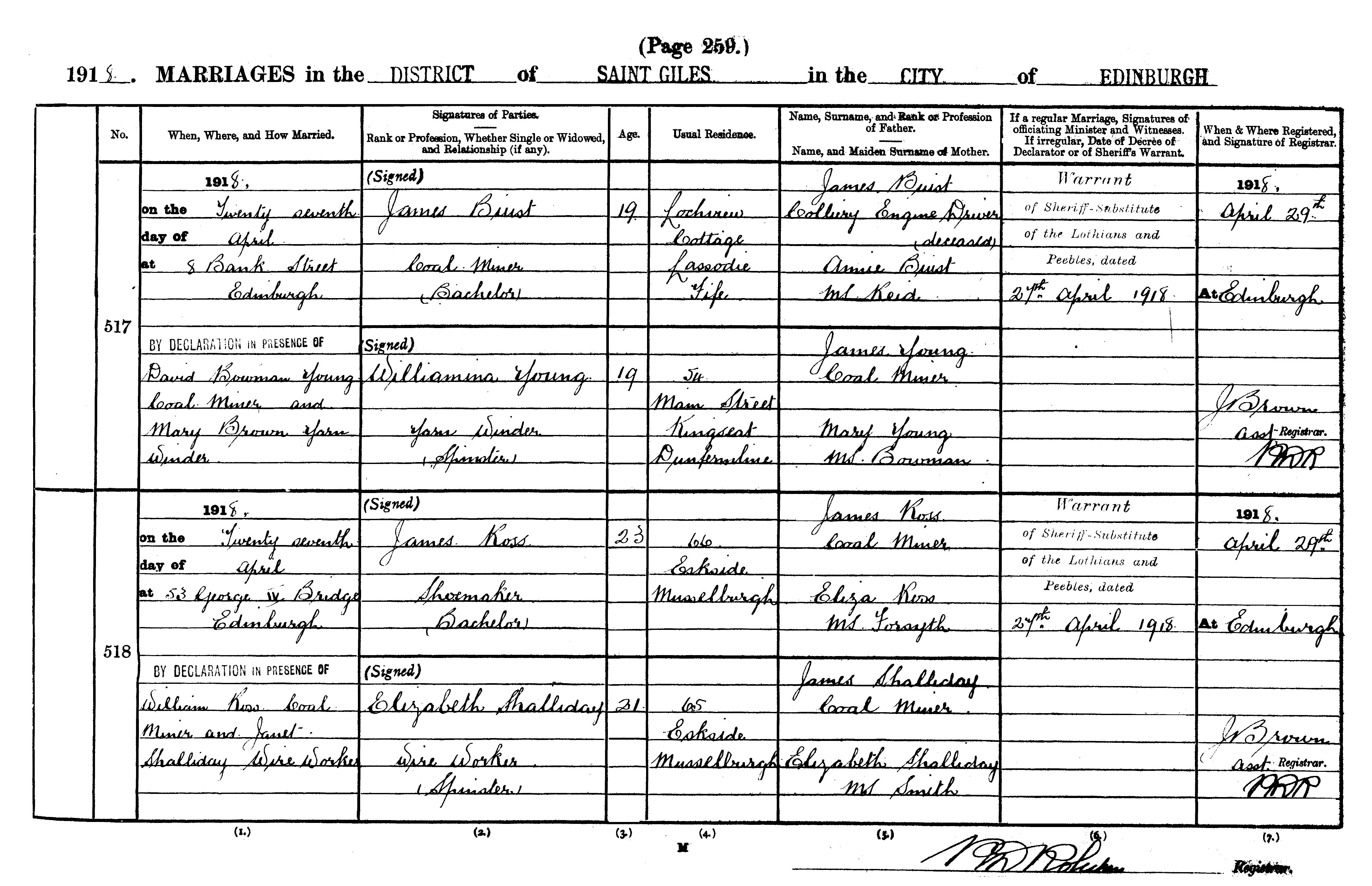 | 271 | SP | STAT | CEN | 1921 | R251.jpg | 1921-06-19 CEN John James Kerr + Maria Nimmo McDonald 90 North High St Musselburgh [[R251]] | LOCAL | ONLINE |