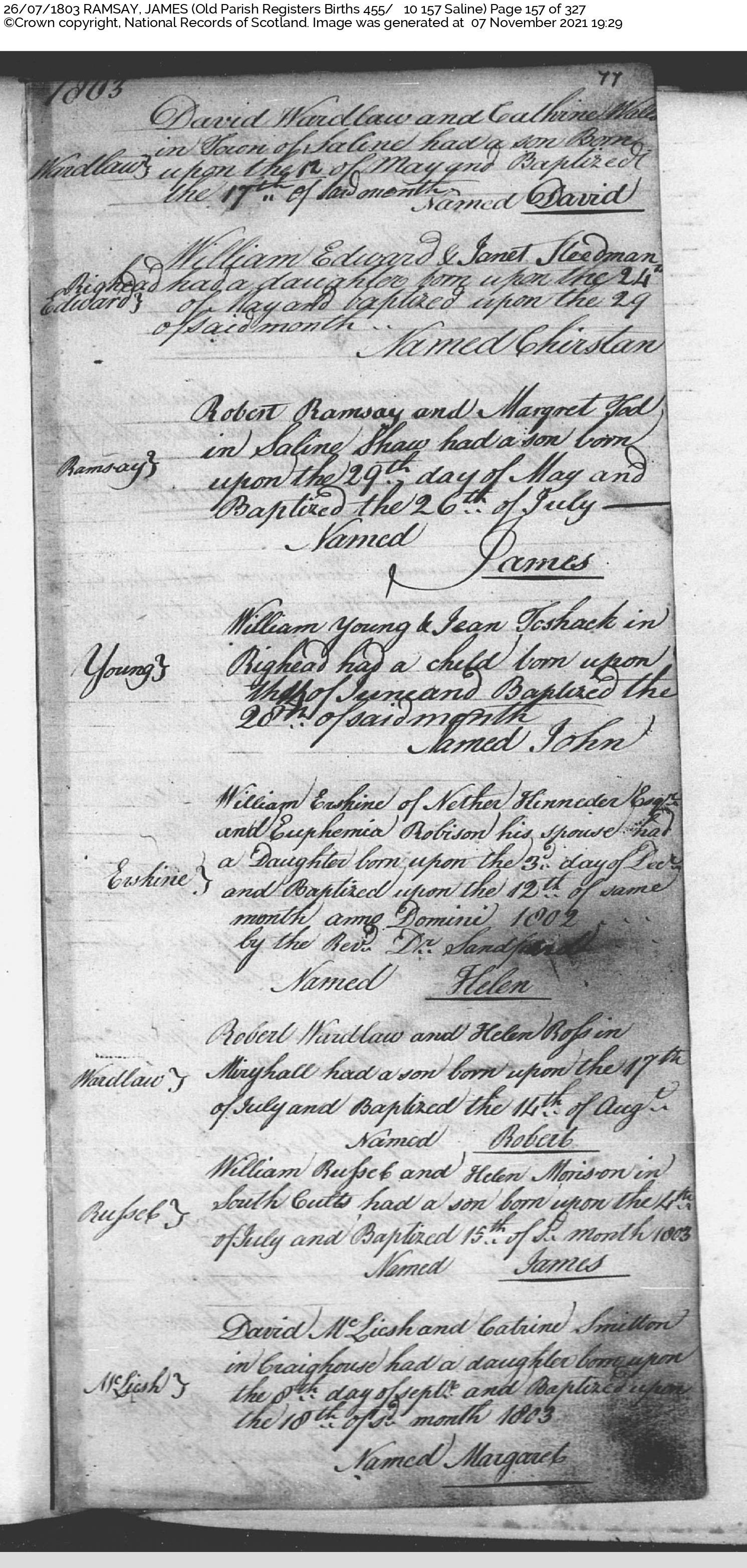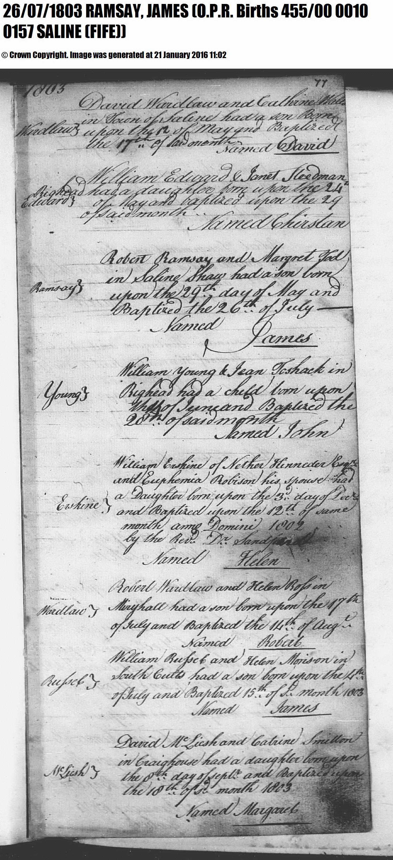 | 354 | ANC | CH | BIR BAP | 1803 | R322.jpg | 1803-05-29 BIR BAP James Ramsay child of Robert Ramsay & Margaret Tod, Saline [R322] | LOCAL | ONLINE |