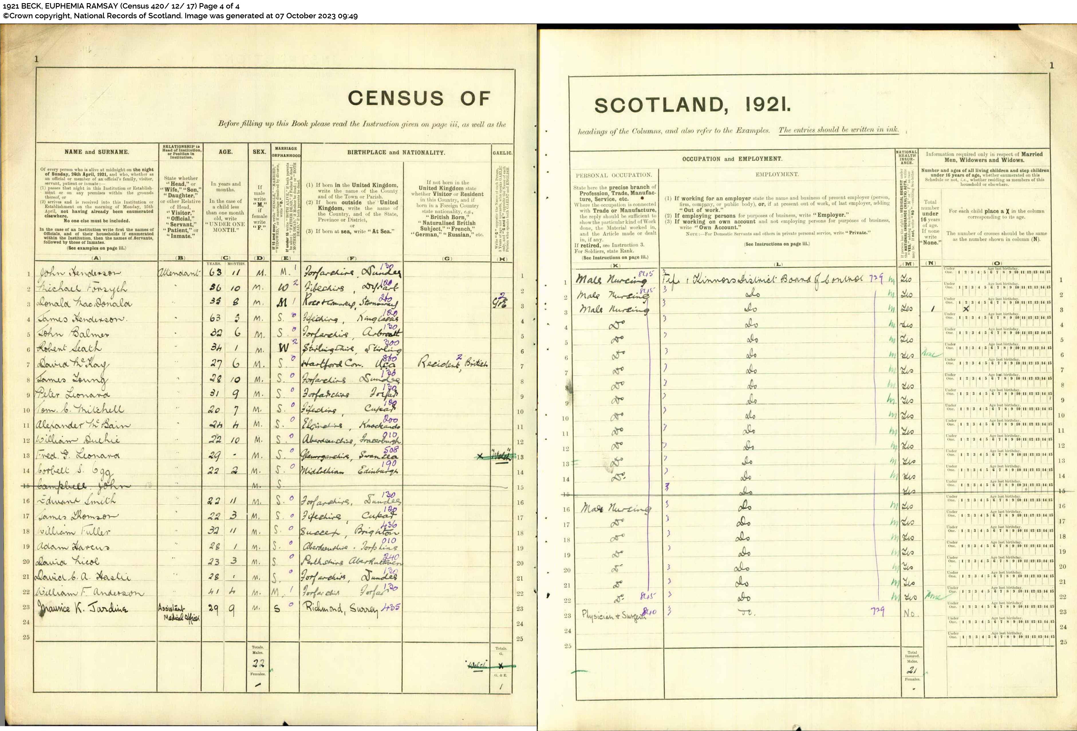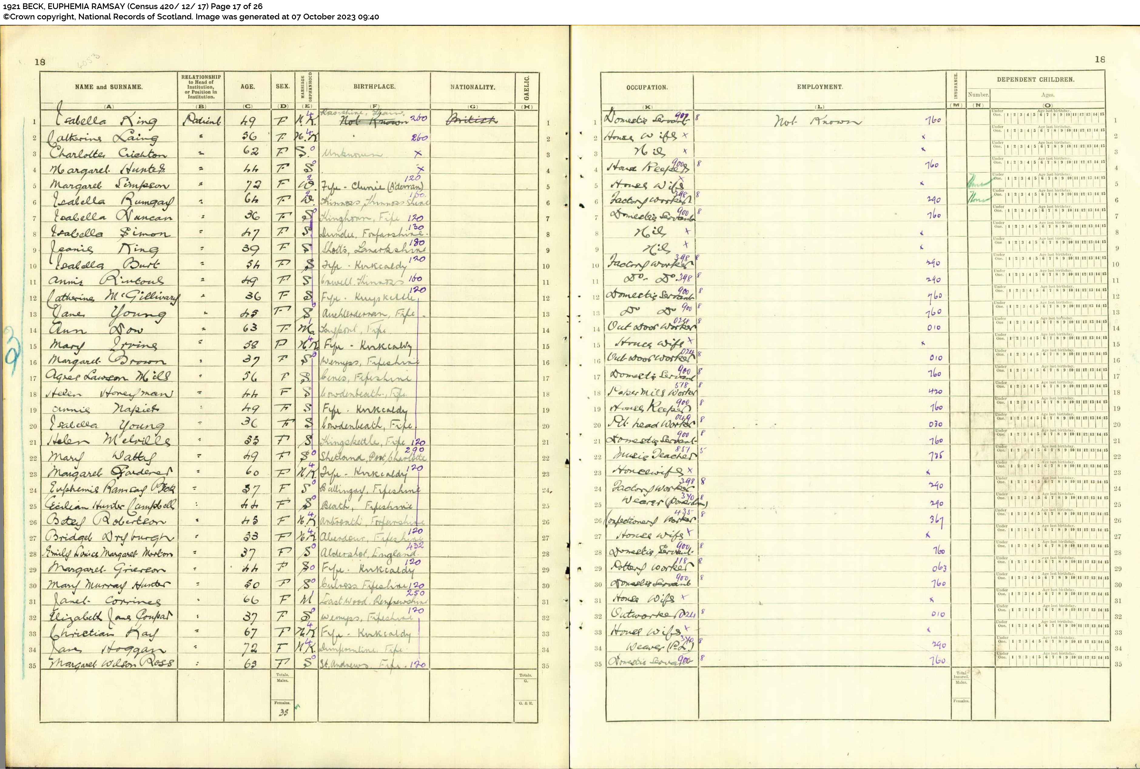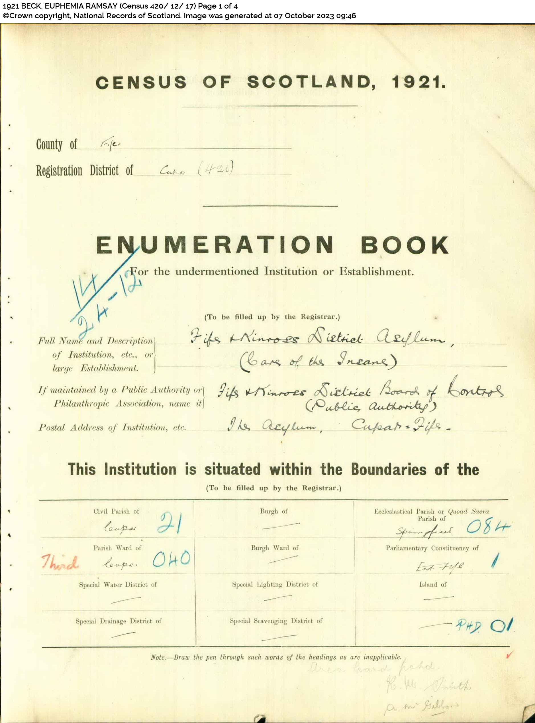 | 284 | SP | STAT | CEN | 1921 | R261.jpg | 1921-06-19 CEN Euphemia Ramsay Beck – Fife and Kinross Asylum [[R261]] | LOCAL | ONLINE |