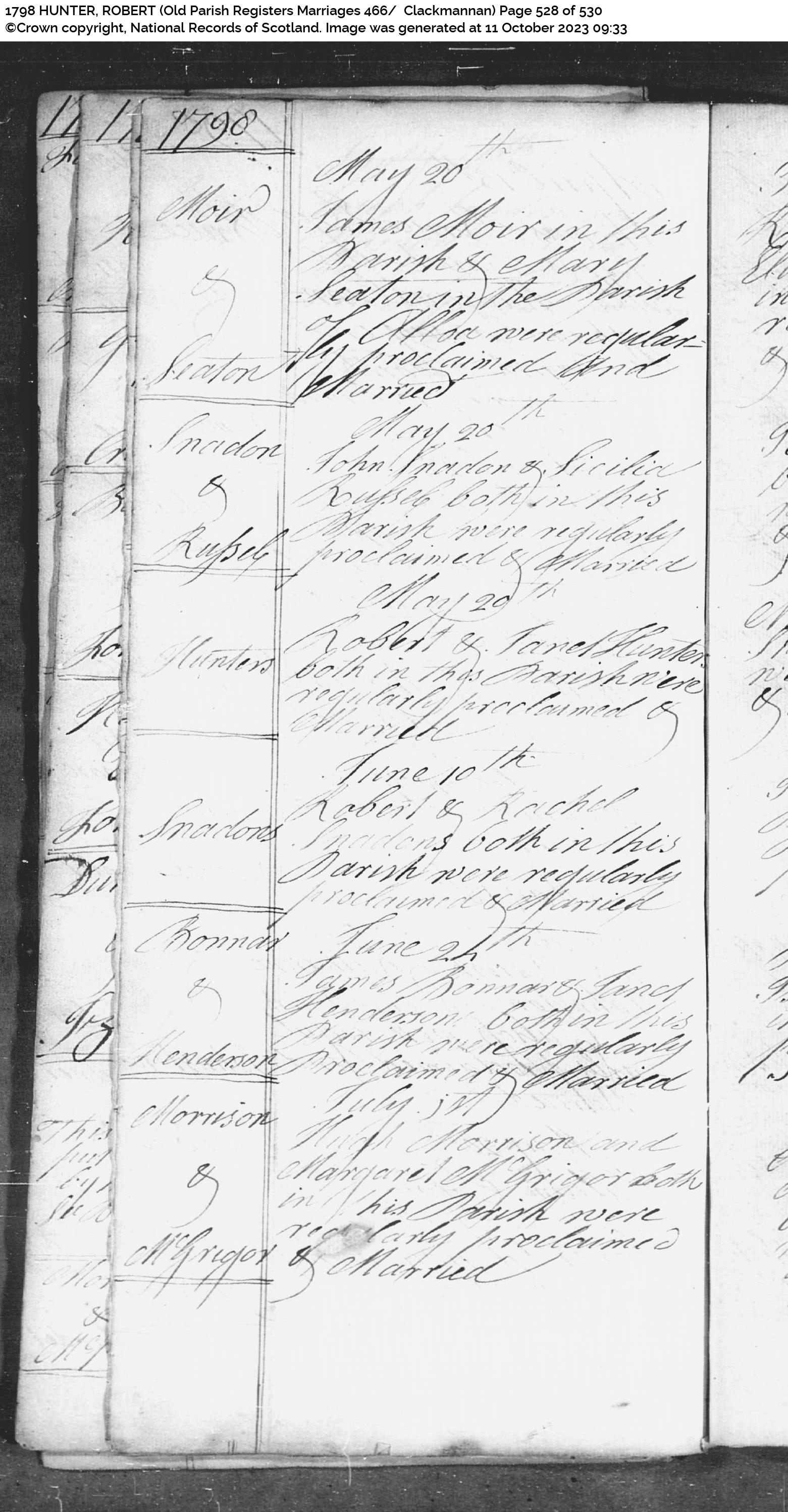 | 300 | SP | CH | MAR | 1798 | R270.jpg | 1798-05-20 MAR Robert Hunter + Janet Hunter, Clackmannan [[R270]] | LOCAL | ONLINE |