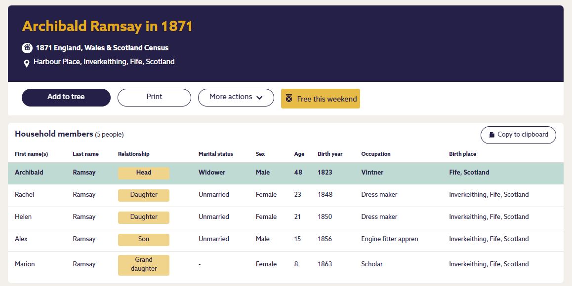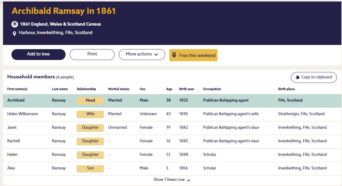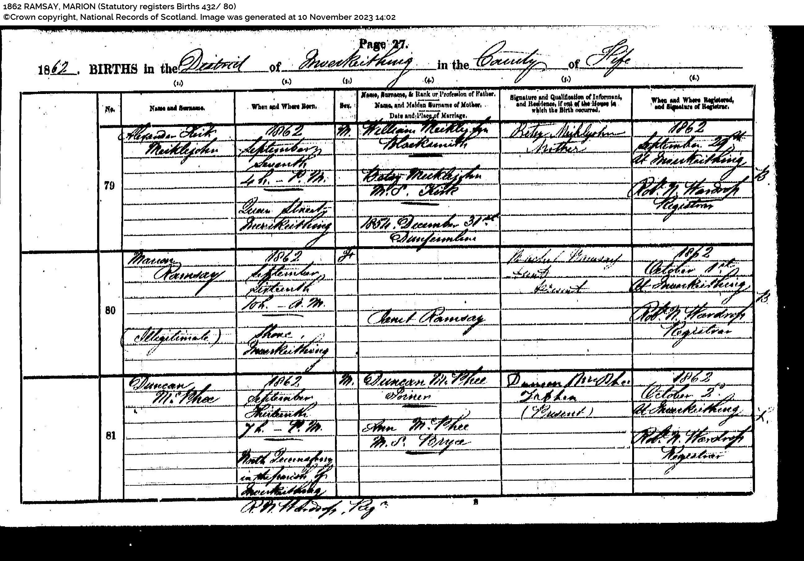 | 329 | FMP | STAT | CEN | 1861 | R299.jpg | 1861-04-07 CEN Archibald Ramsay + Helen Williamson – Harbour, Inverkeithing [[R299]] | LOCAL | ONLINE |