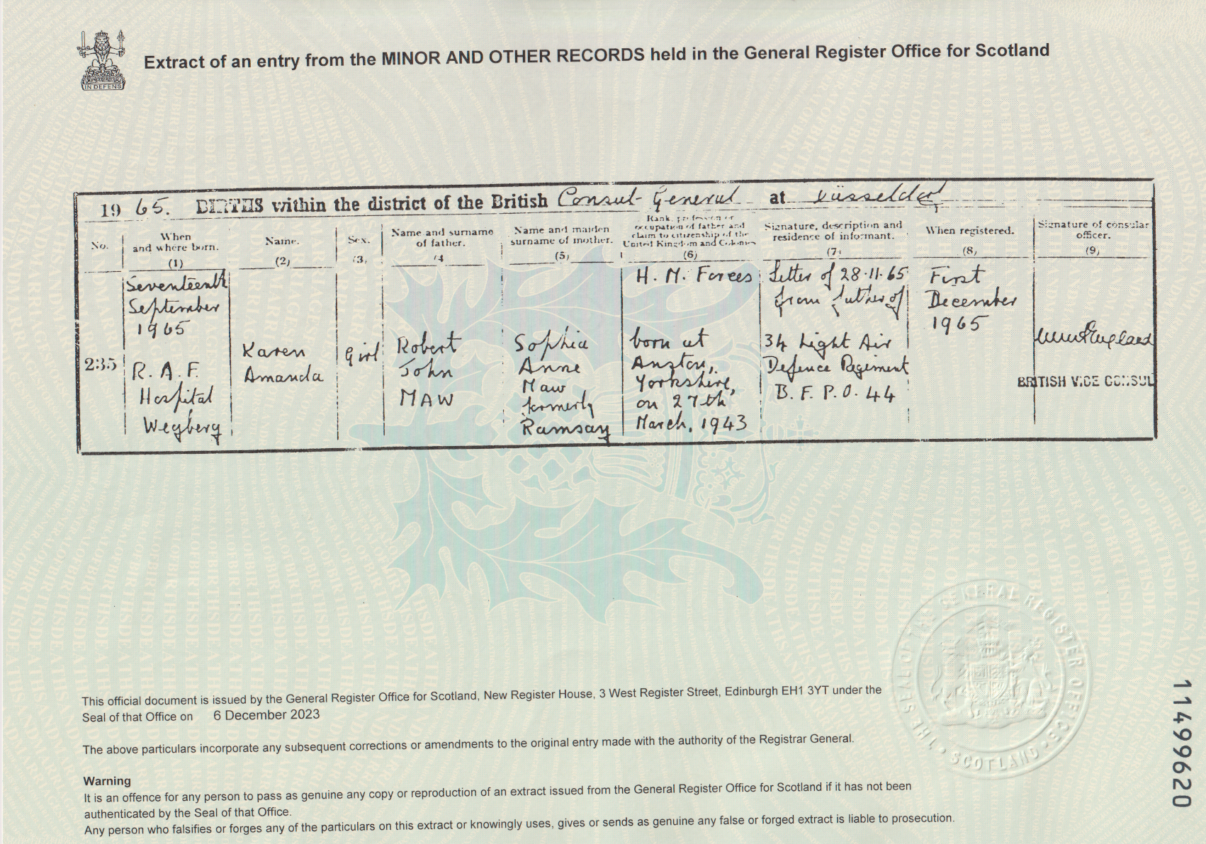 | 340 | FMP | STAT | BIR | 1965 | R309b.jpg | 1965-09-17 BIR Karen Amanda Godsell child of Sophia Anne Godsell + Robert J Maw [[R309b]] | LOCAL | ONLINE |