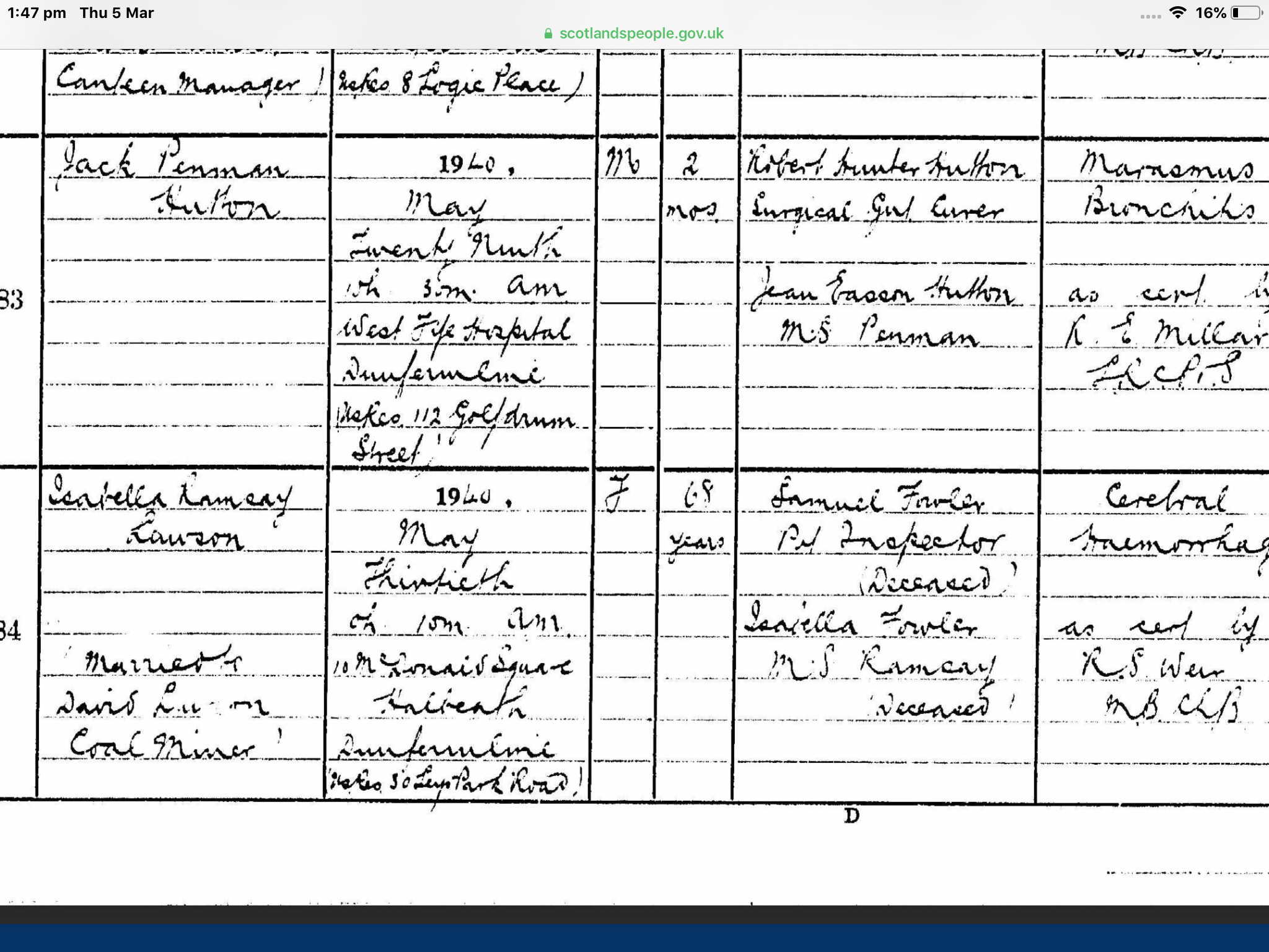 | 352 | ANC | STAT | DEA | 1940 | R320.jpg | 1940-05-30 DEA Isabella Fowler wife of David Lawson, 10 McDonald Square, Halbeath [[R320]] | LOCAL | ONLINE |