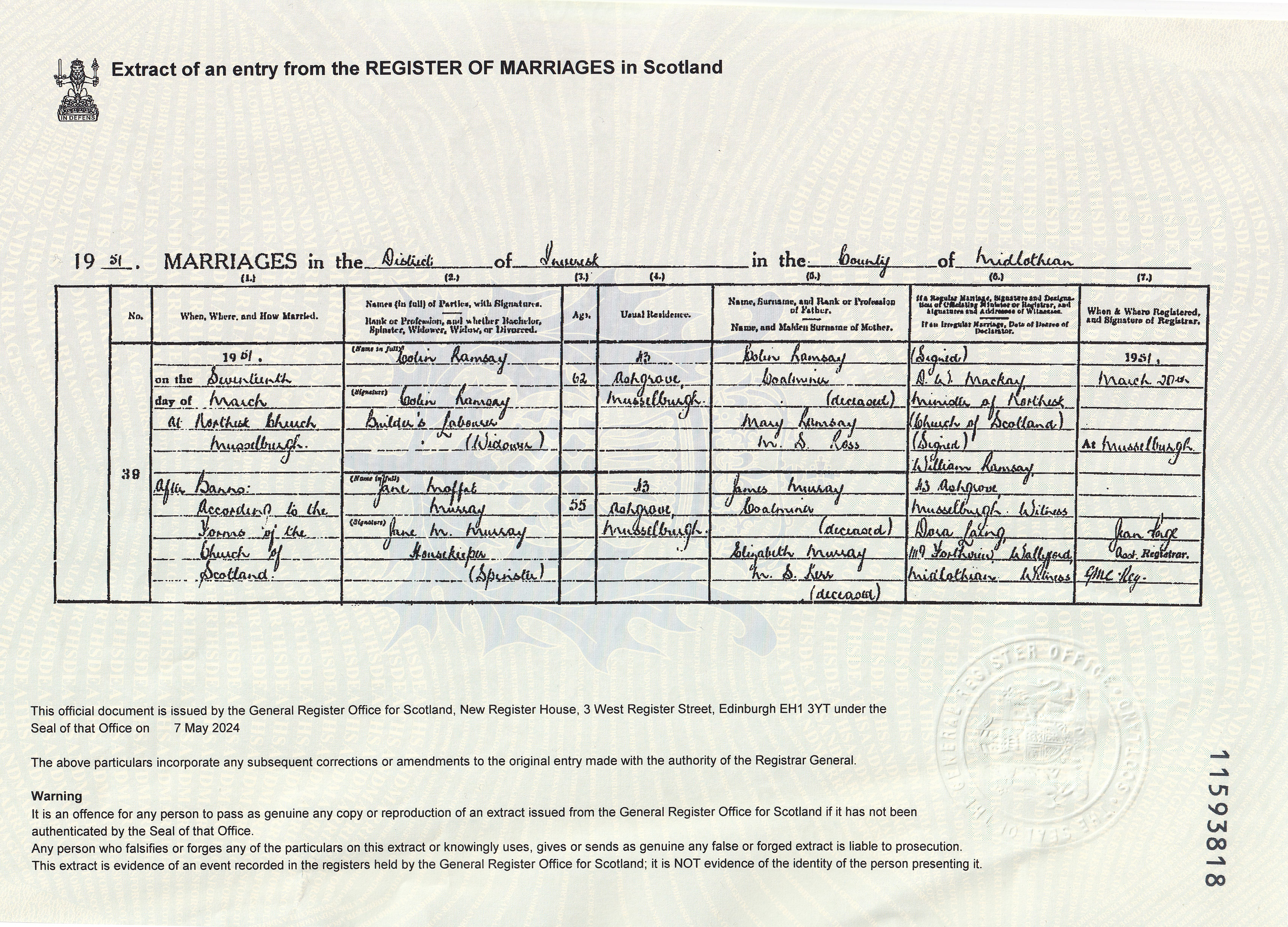 | 360 | SP | STAT | MAR | 1951 | R327.jpg | 1951-01-17 MAR Colin Ramsay + Jane Moffat Murray, Norhtesk Church, Musselburgh [[R327]] | LOCAL | n/a |