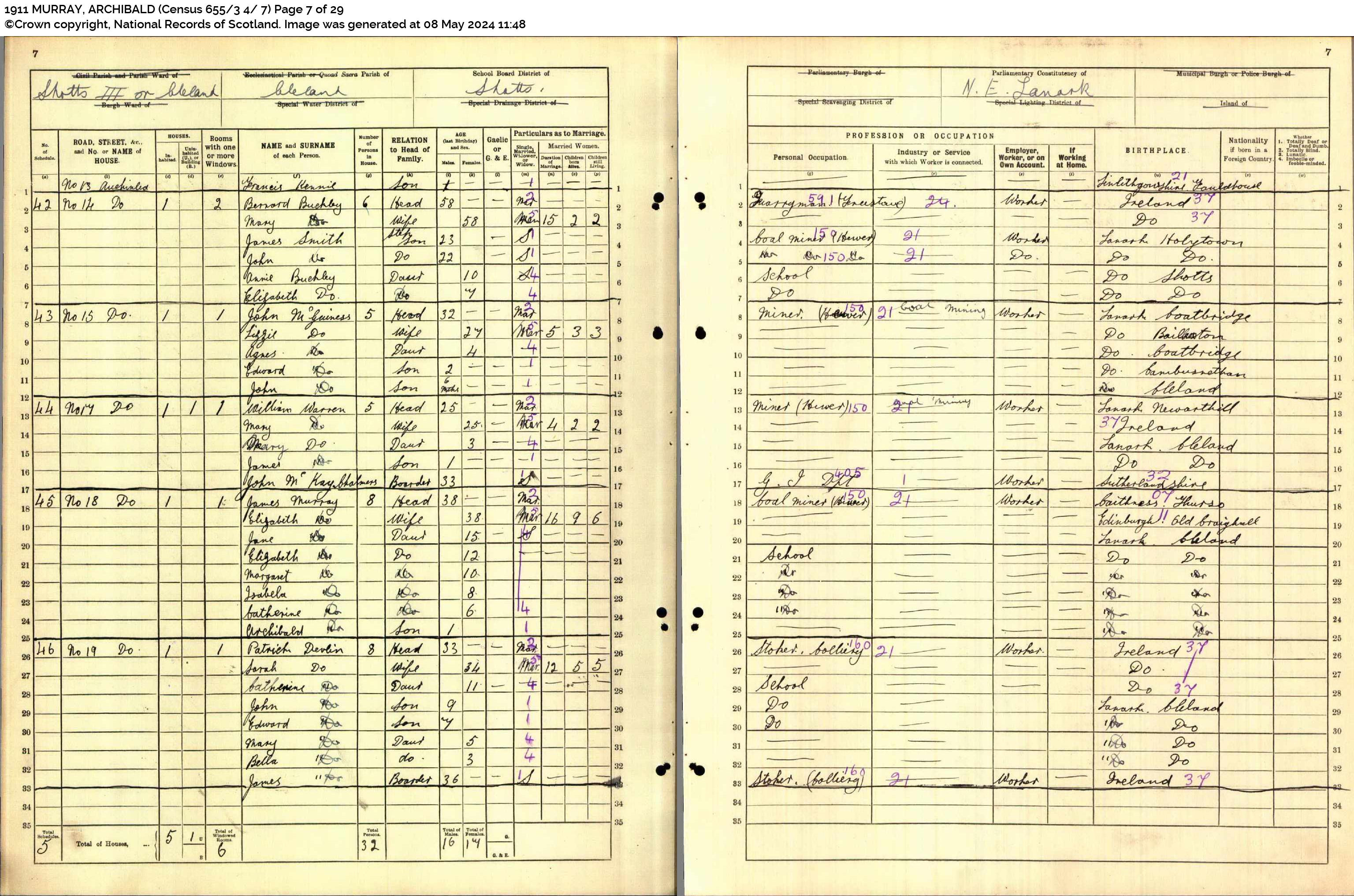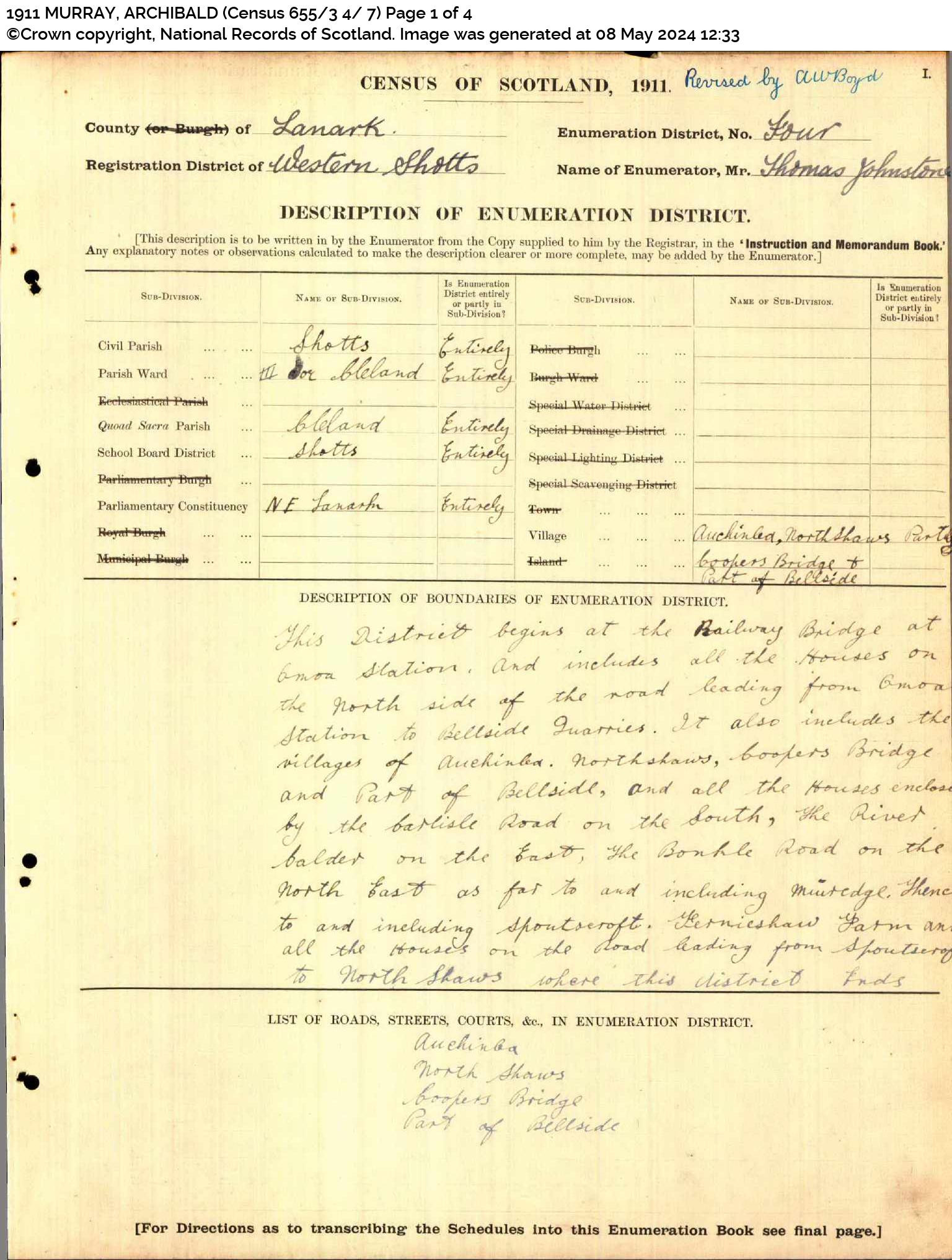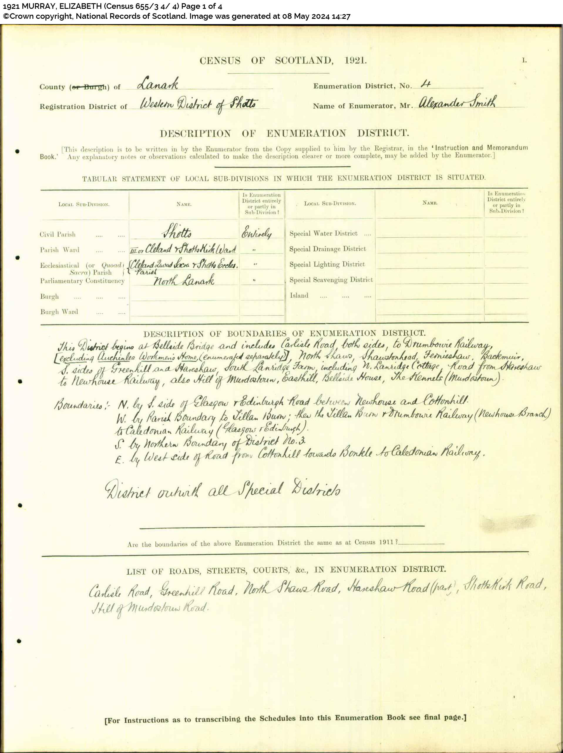 | 363 | SP | STAT | CEN | 1921 | R329.jpg | 1921-06-19 CEN James Murray + Elizabeth Kerr 12 Auchinlee, Carlisle Road, Cleland, Lanarkshire [[R329]] | LOCAL | ONLINE |