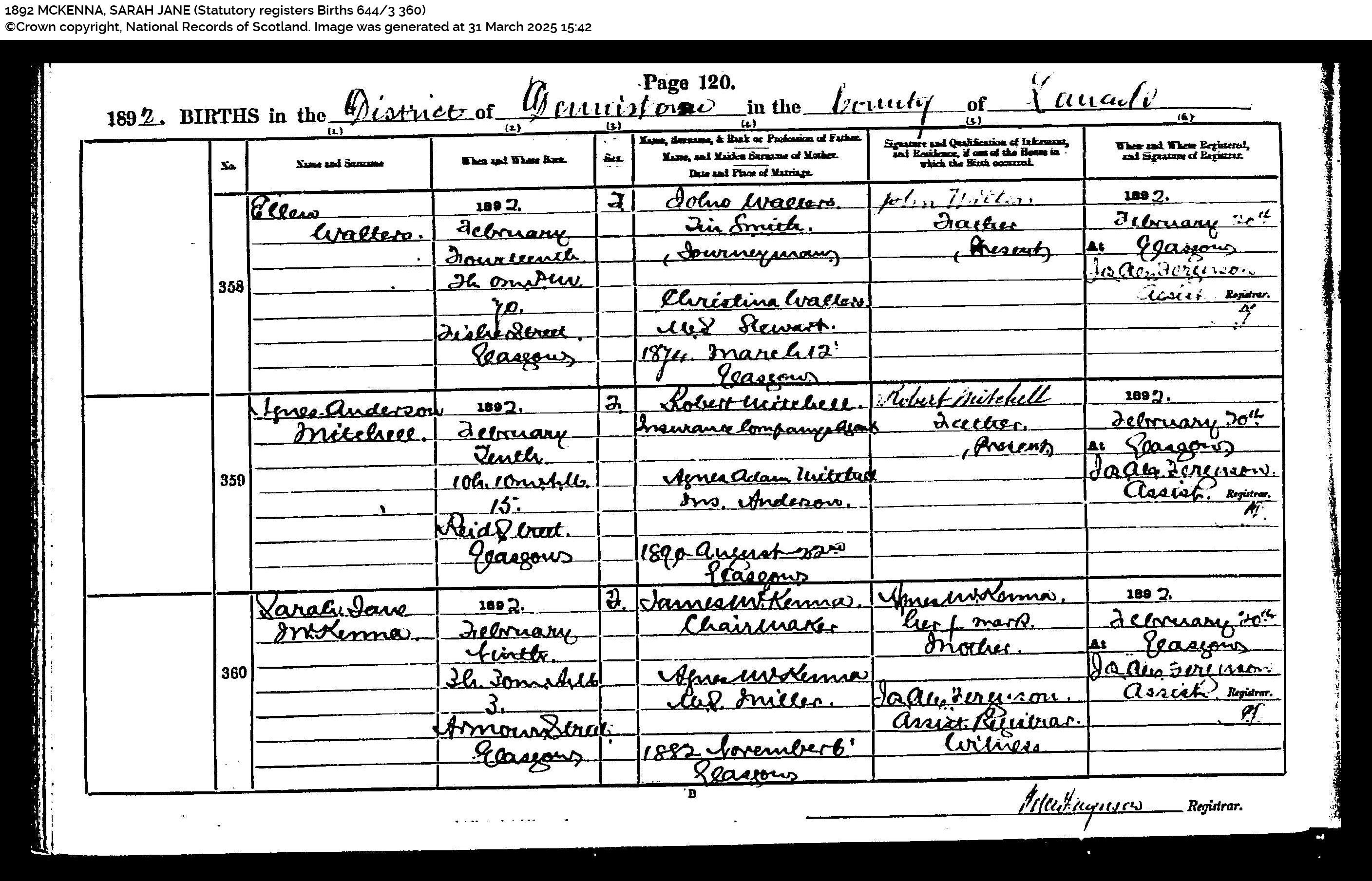 Birth of Jane Miller McKenna 1884 in Glasgow