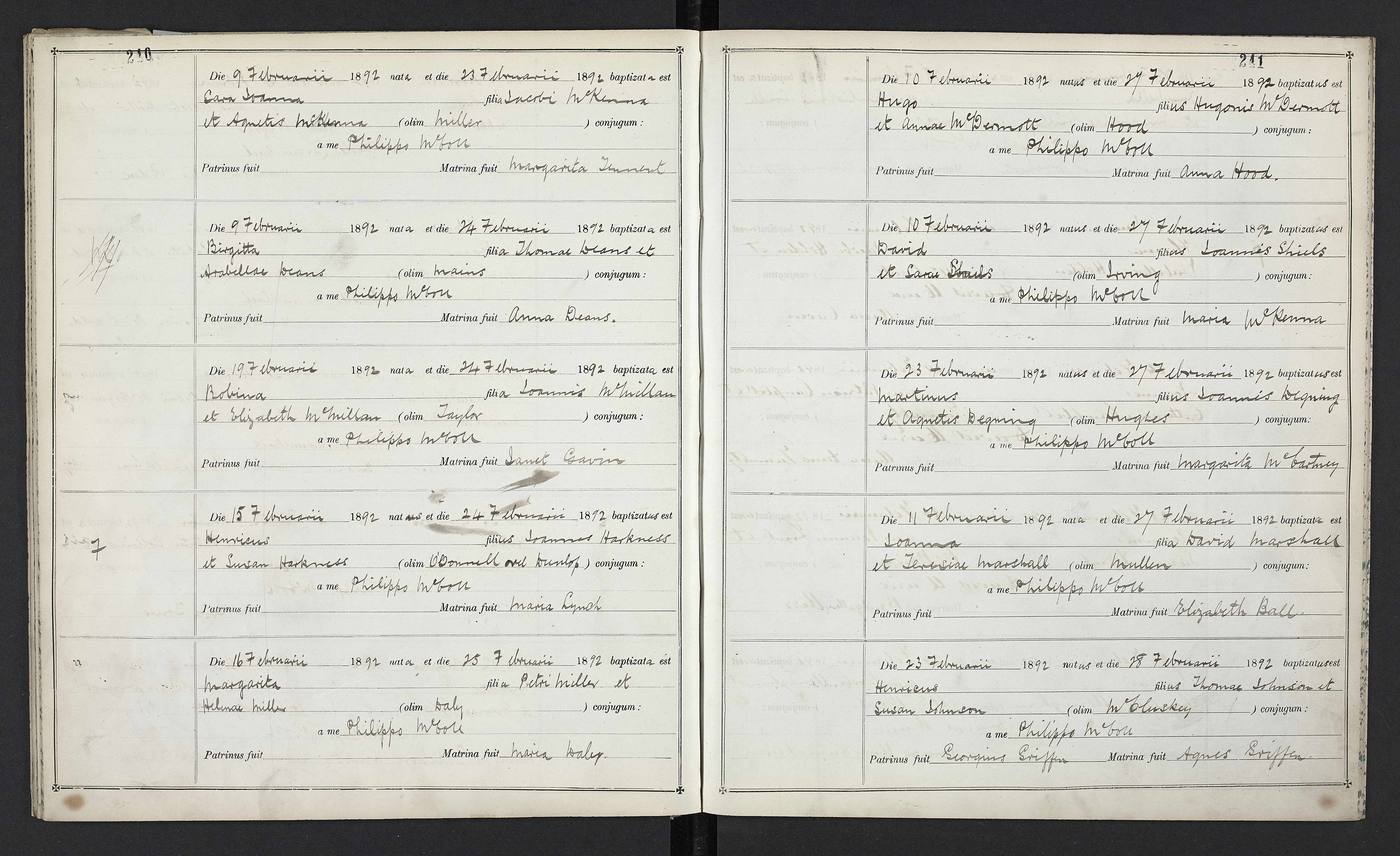 [born] The 9th February 1892 [baptised] 23 February 1892 Sara Joanna [child of] Jacobi McKenna [and] Agnetis McKenna [alim] Miller. [Baptised by me] Phillippo McColl [Matrina fuit] Margarita Tennant