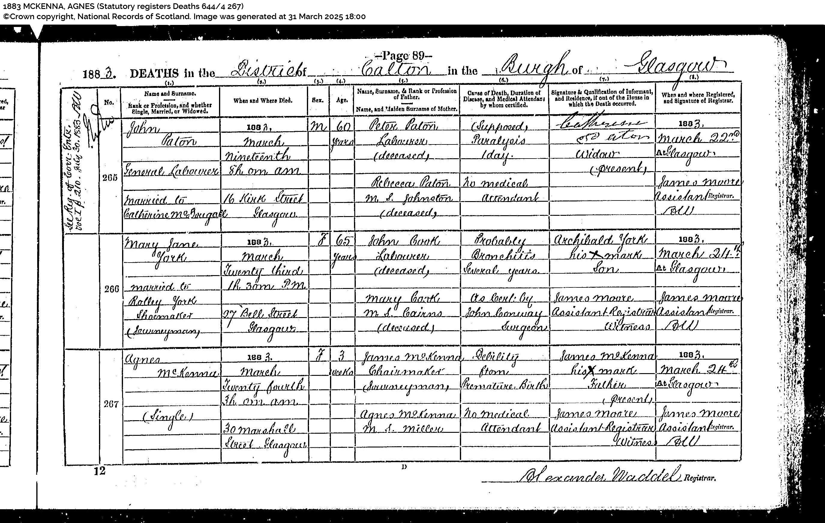 Death of Agnes McKenna 24 Mar 1883 at 30 Marshall Street, Calton, Glasgow