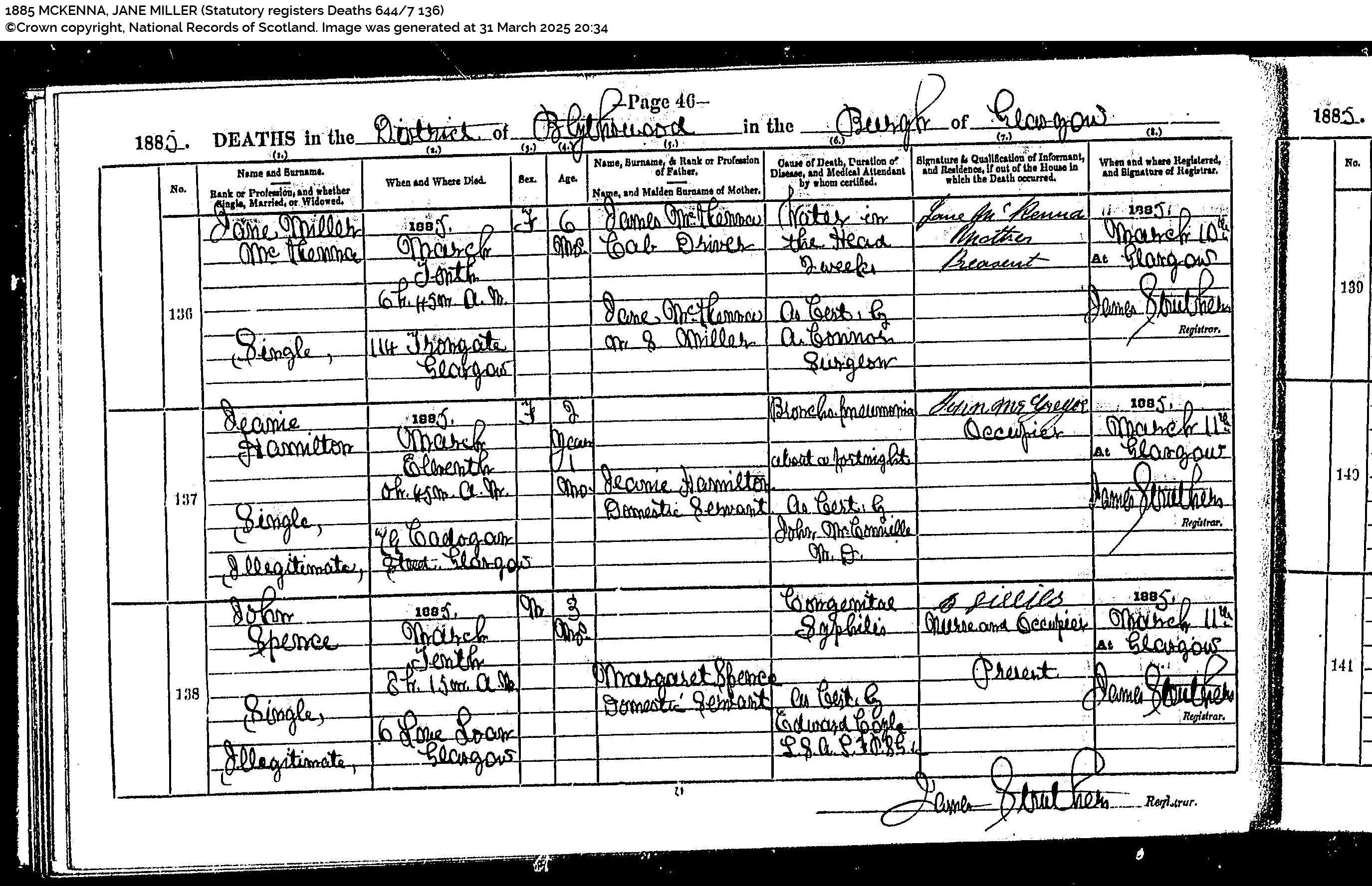 Death of Jane Miller McKenna 10 Mar 1885 at 114 Trongate, Glasgow