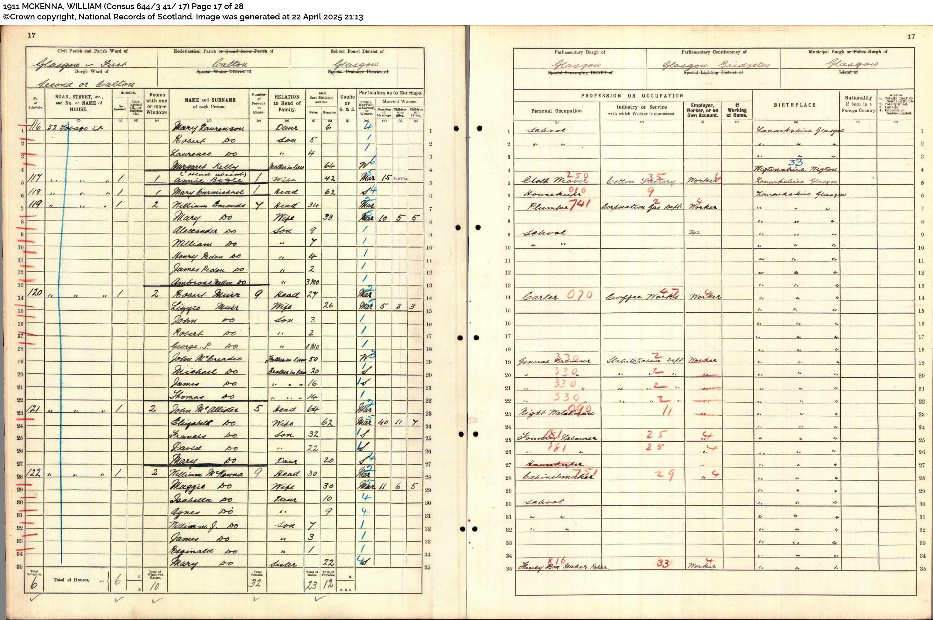 | William J McKenna | Son | 17y 4m | M | S | Glasgow, Lanarkshire | Message Boy | W | Lindsay Box Co, Fancy Paper Boxmakers | M | ||