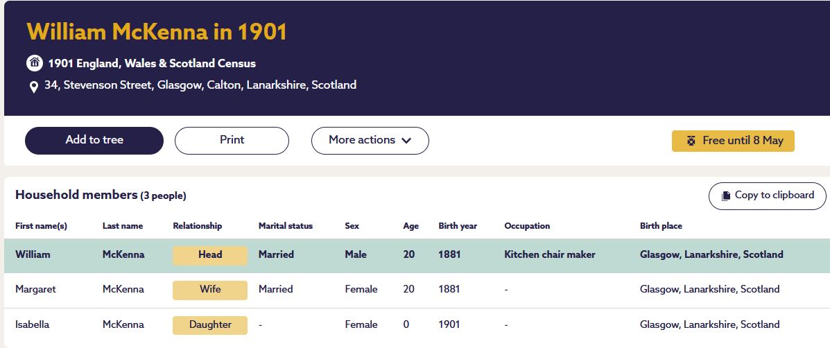 | Isabella McKenna | Daughter | S | F | 0 | Glasgow, Lanarkshire |