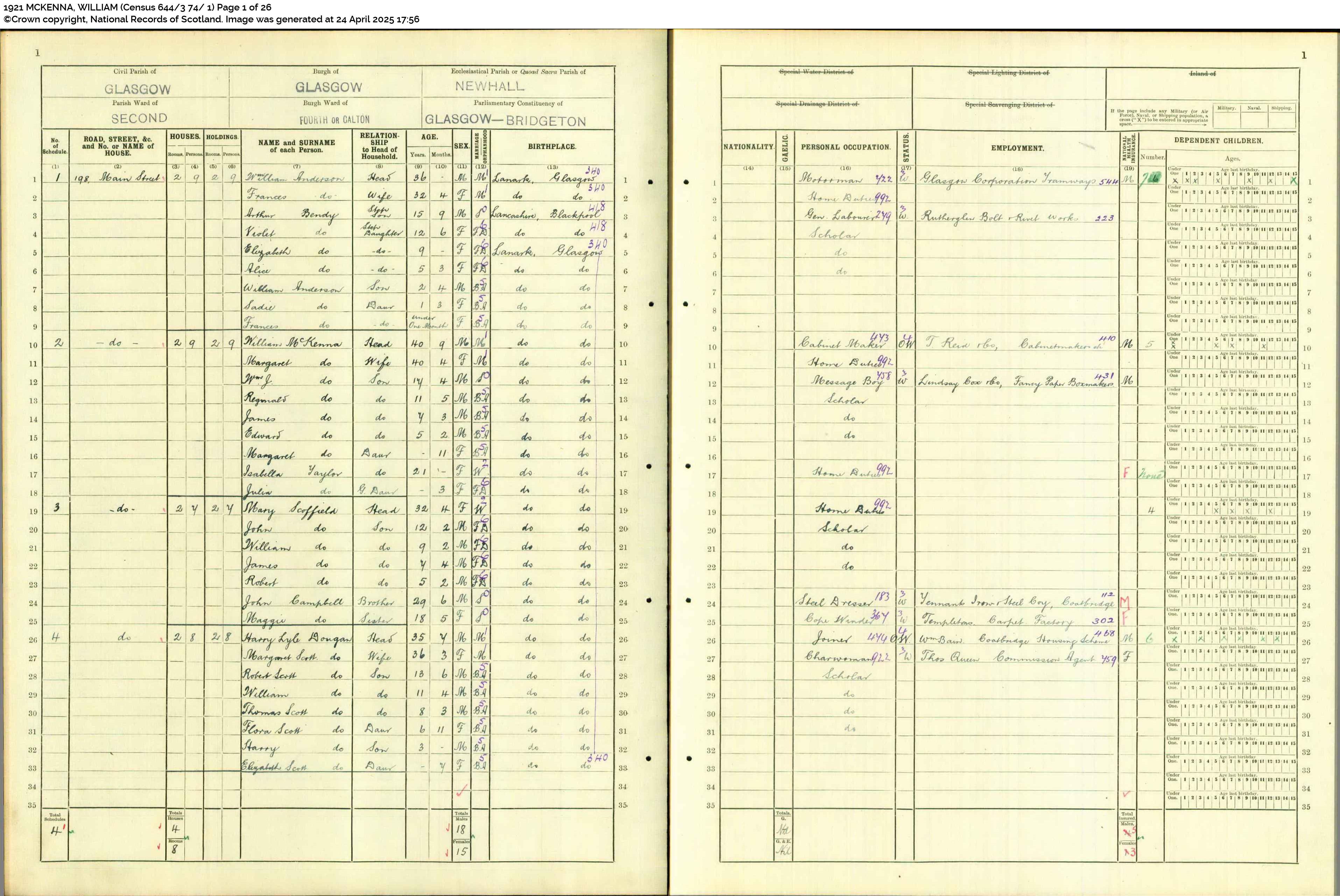 William McKenna at the 1921 Census – 198 Main Street, Calton, Glasgow